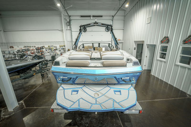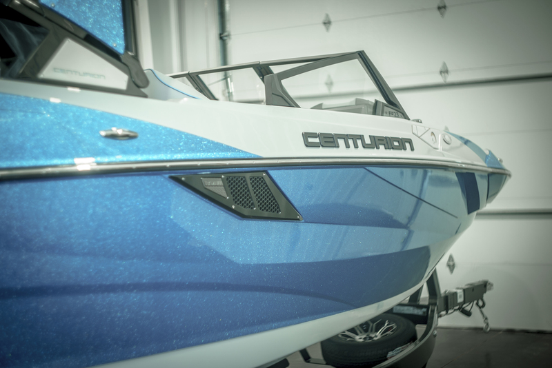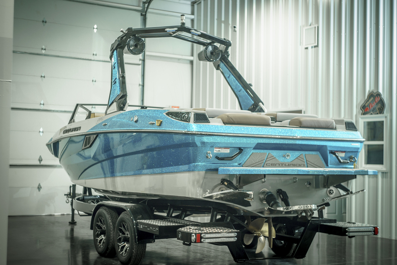 • The Core Gelcoat Scheme in Mist Blue Metal Flake and Stone Gray, along with the DROPZONE Auto Tower, offers a sleek and customizable aesthetic.
