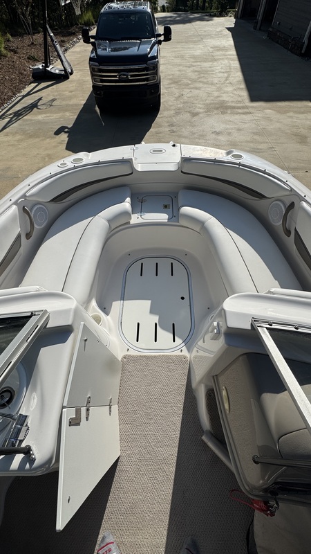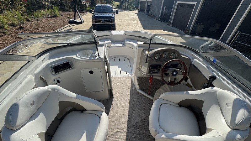 • The boat comes with a snap-in carpet, cushioned seating, storage compartments, and an open-bow layout.